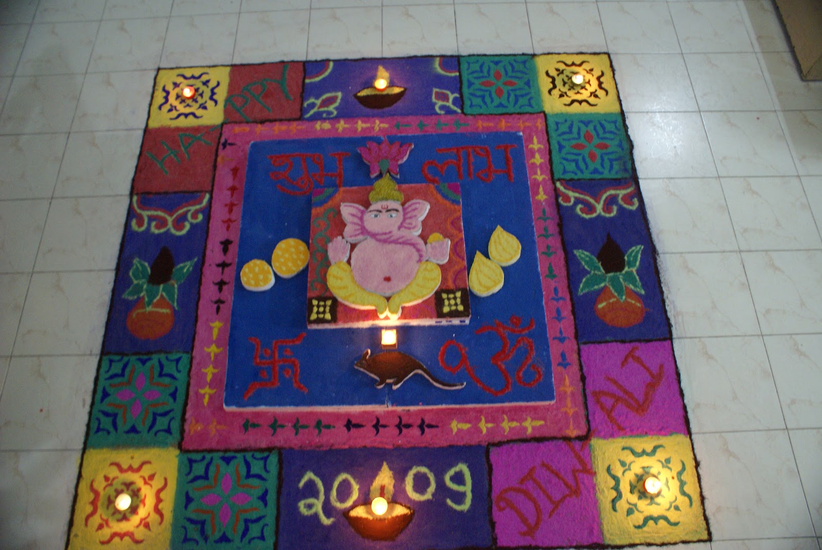 The rangoli in the photograph was made with sooji/rava mixed with colour and thermocol was used to give it a layered effect.